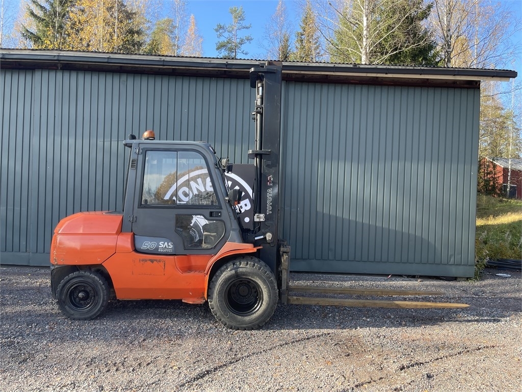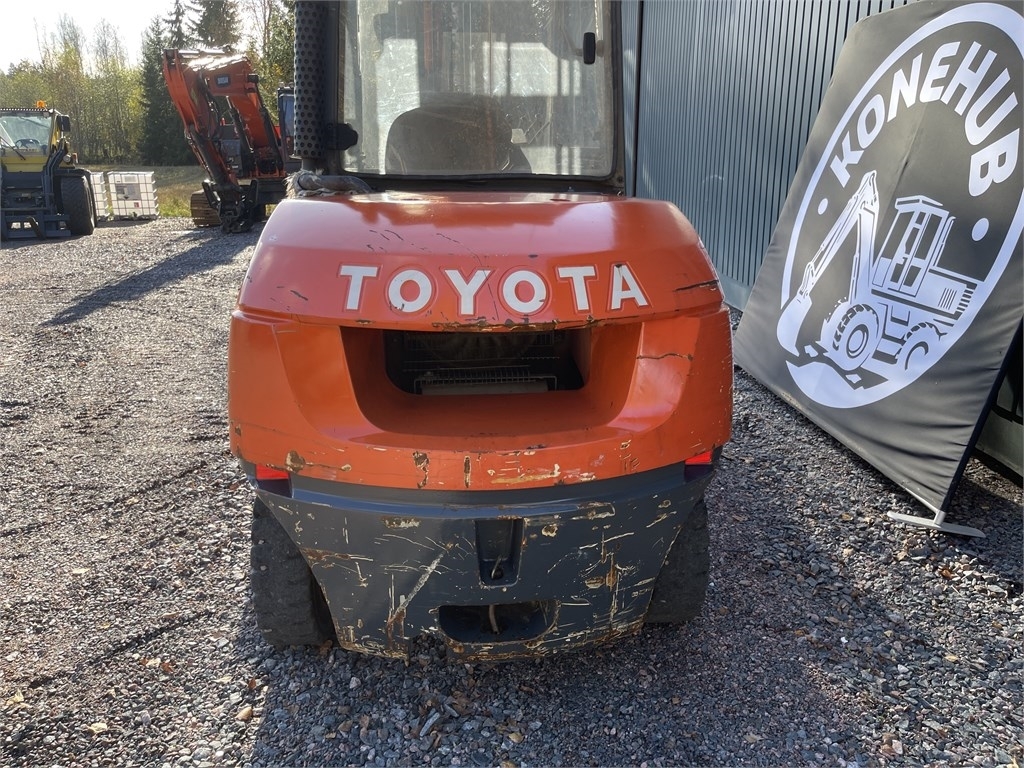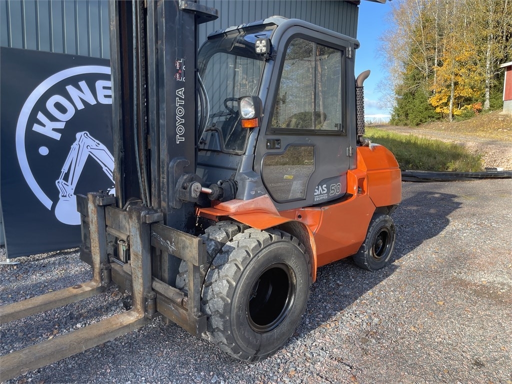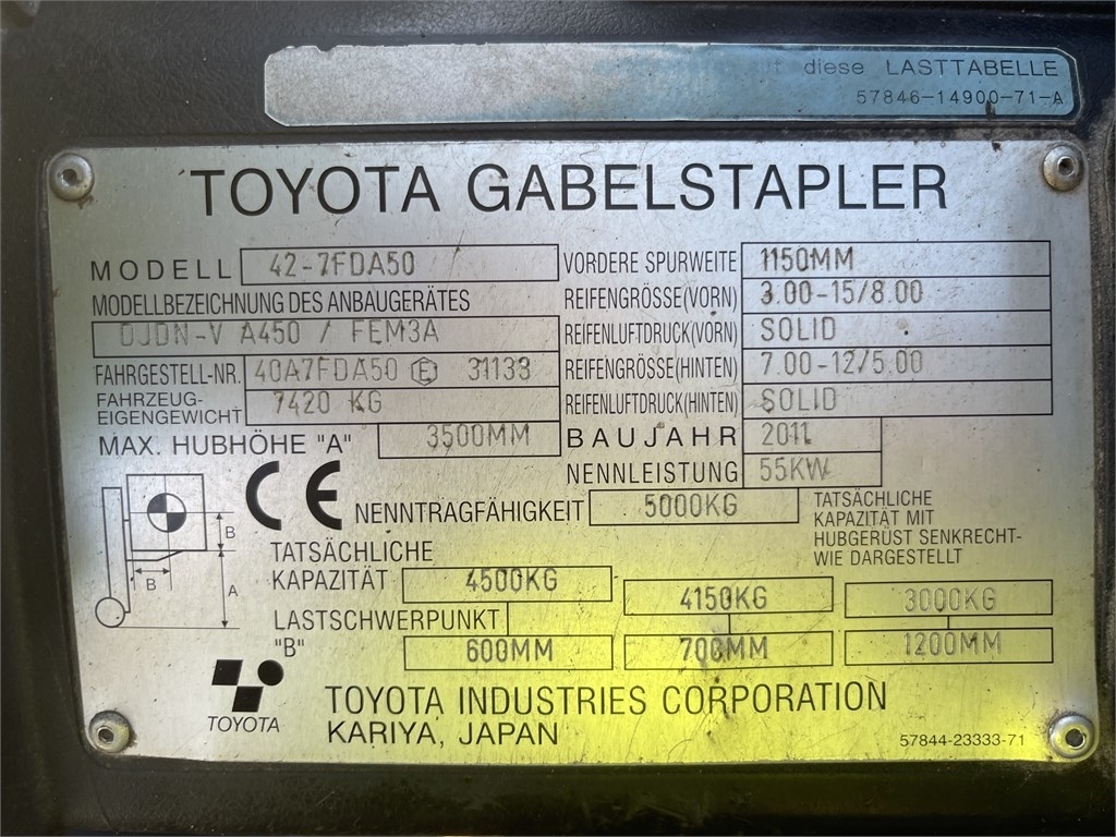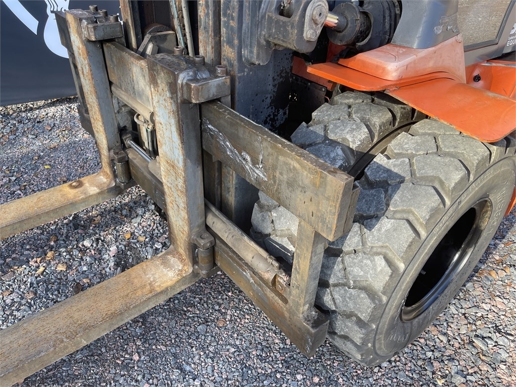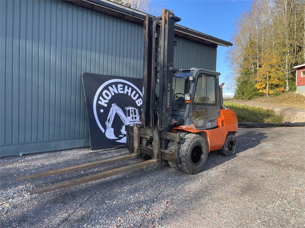 Myynnissä järeä diesel trukki pitkillä piikeillä moneen hommaan. Toyota 42-7FDA50. Vuosimalli: 2011. Käyttötunnit: 12642. Nostokyky: 4500kg. Nostokorkeus: 3500mm. Nimellinen nostokyky: 5000kg. Haarukoiden levitys, kavennus ja sivusiirto. Akut juuri vaihdettu.