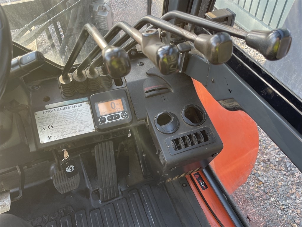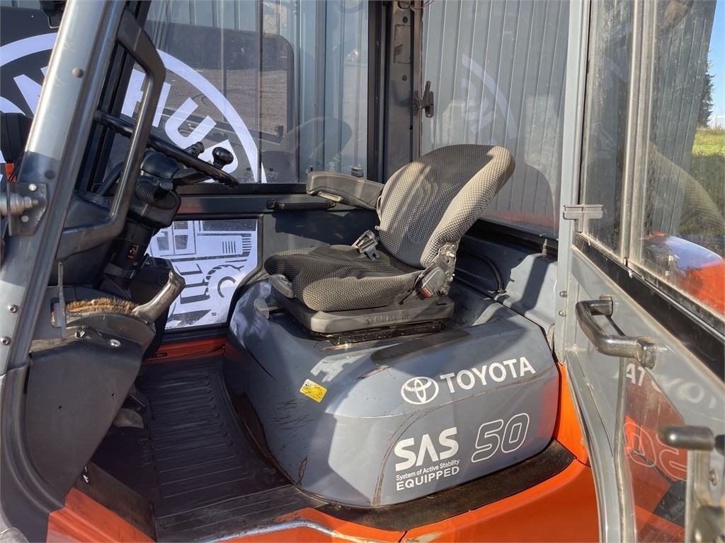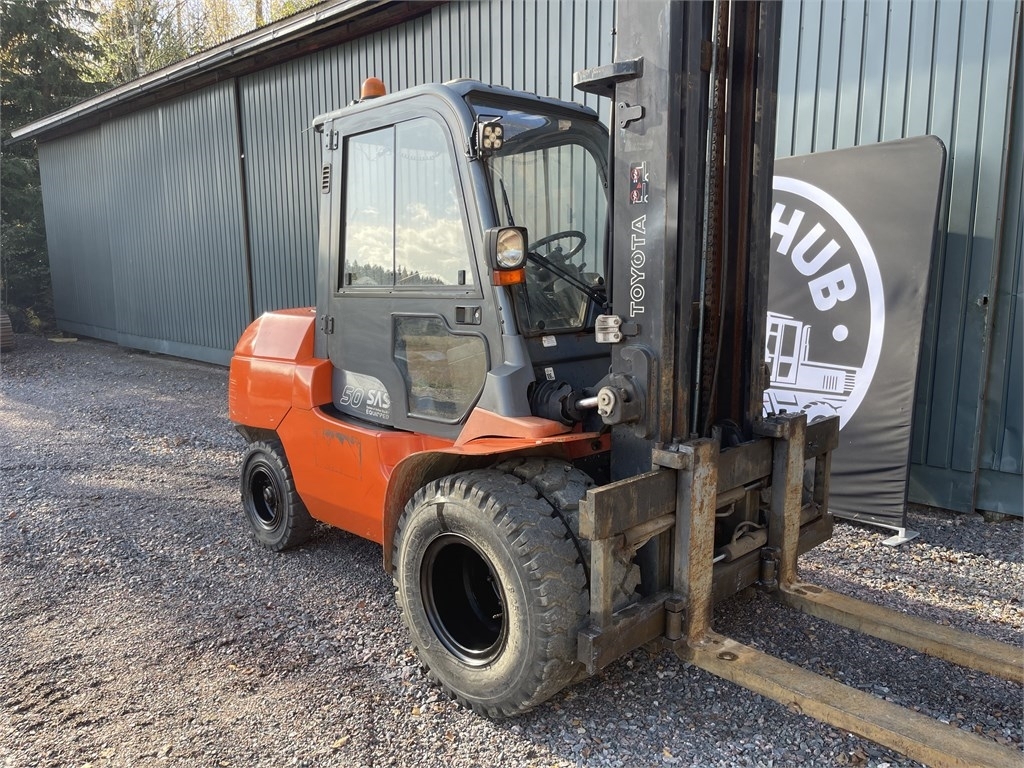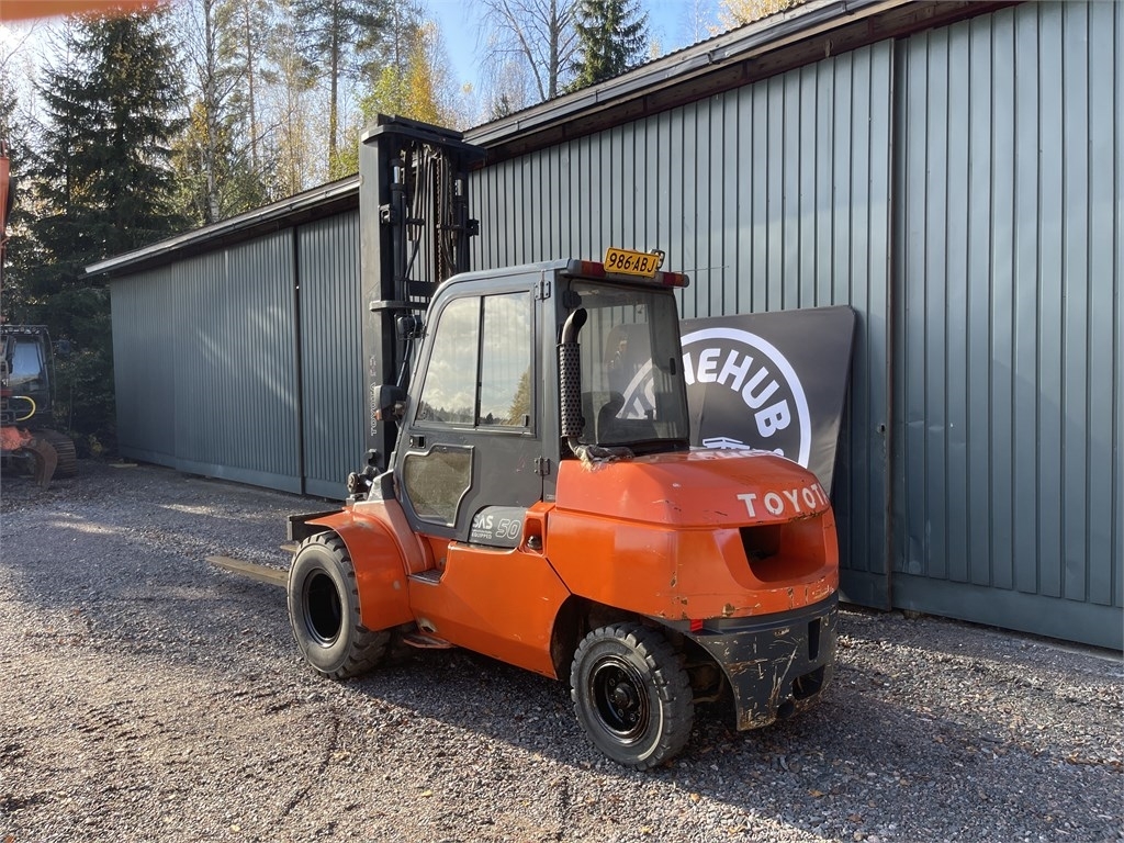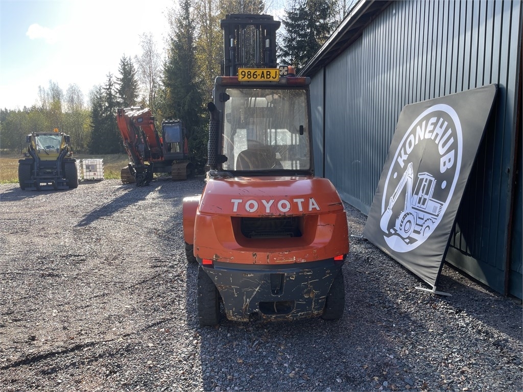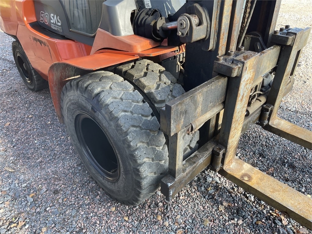 Myynnissä järeä diesel trukki pitkillä piikeillä moneen hommaan. Toyota 42-7FDA50. Vuosimalli: 2011. Käyttötunnit: 12642. Nostokyky: 4500kg. Nostokorkeus: 3500mm. Nimellinen nostokyky: 5000kg. Haarukoiden levitys, kavennus ja sivusiirto. Akut juuri vaihdettu.
