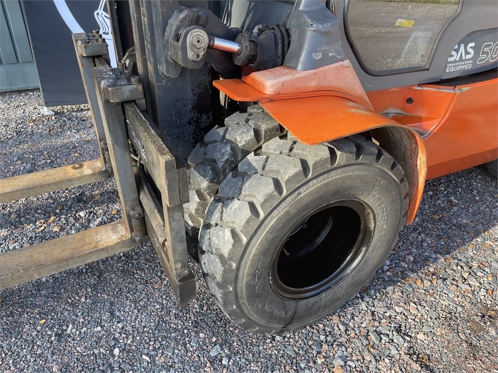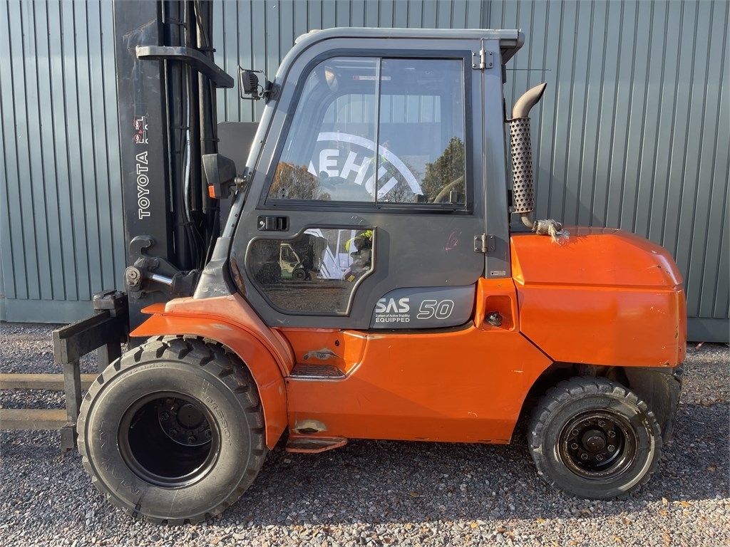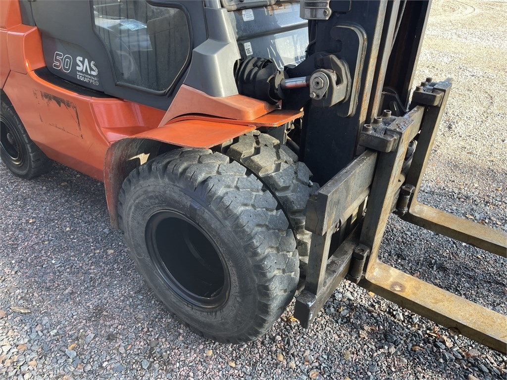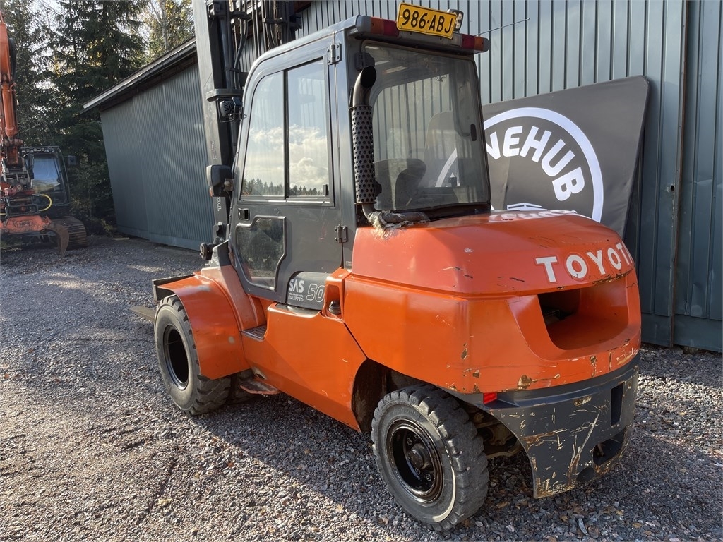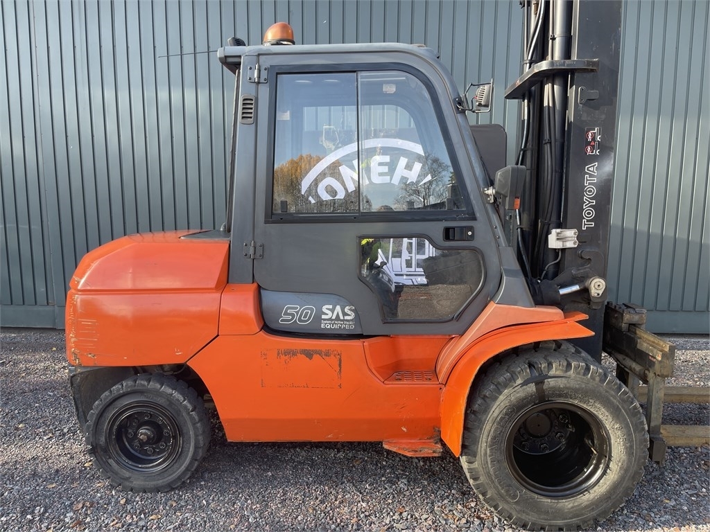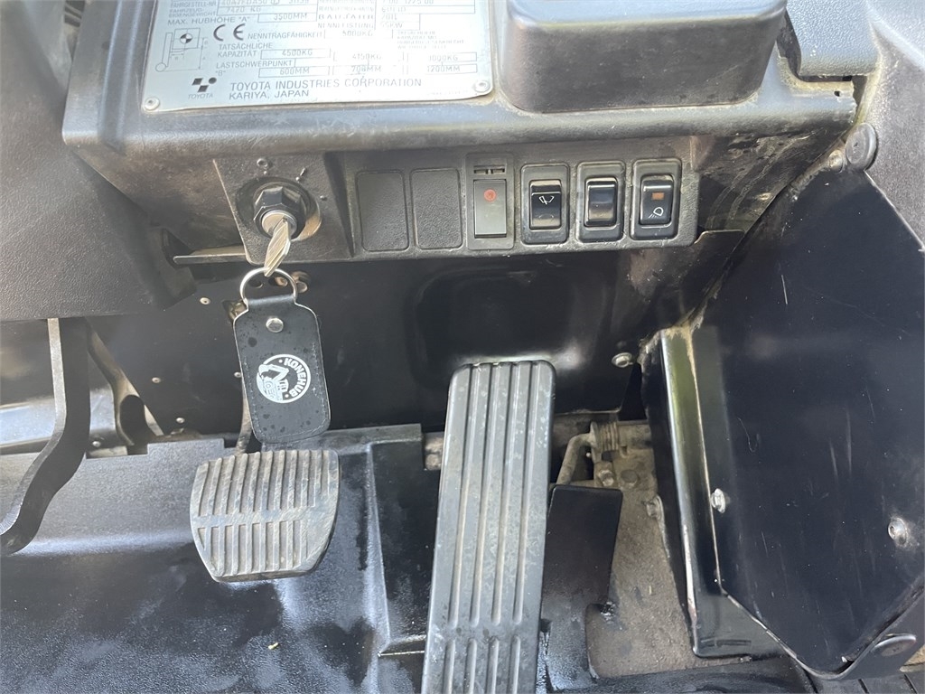 Myynnissä järeä diesel trukki pitkillä piikeillä moneen hommaan. Toyota 42-7FDA50. Vuosimalli: 2011. Käyttötunnit: 12642. Nostokyky: 4500kg. Nostokorkeus: 3500mm. Nimellinen nostokyky: 5000kg. Haarukoiden levitys, kavennus ja sivusiirto. Akut juuri vaihdettu.