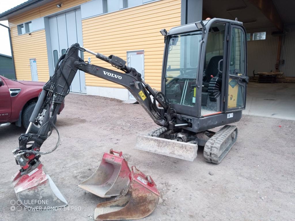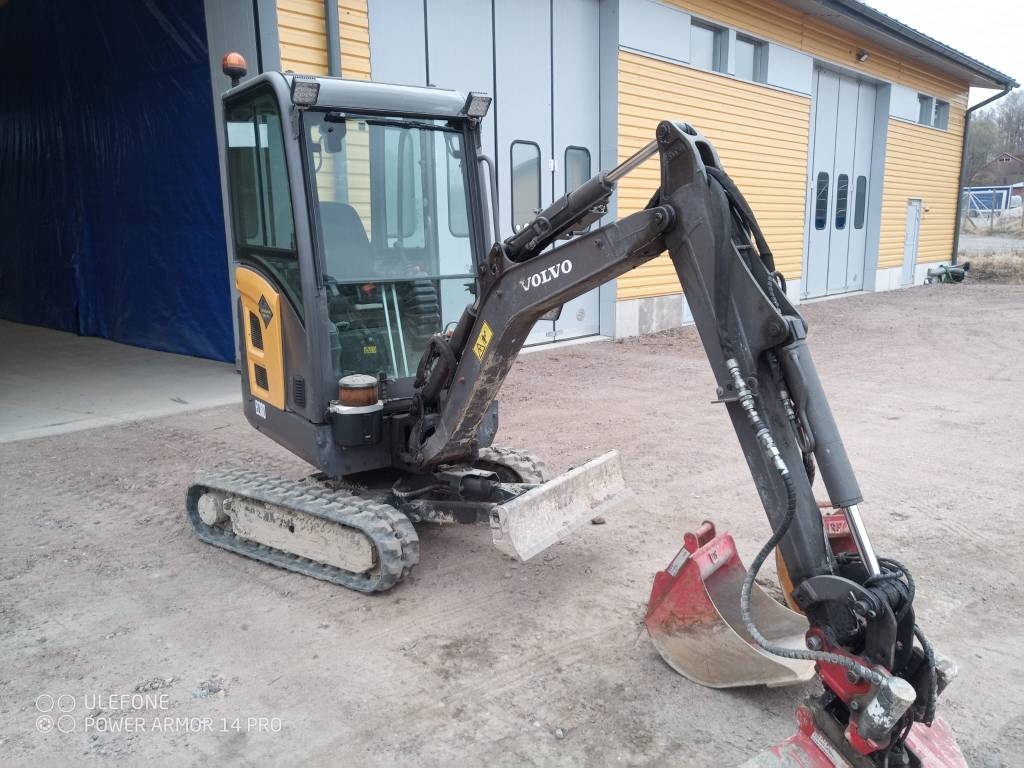 Myyntiin suoraan töistä töihin 1800kg pikku Volvo EC18D. Levittyvät telat, tyvitaitto, rasvari, radio bluetoothilla, kolme kauhaa. Huollon jälkeen ajettu 20h. Alakerta 80 %.